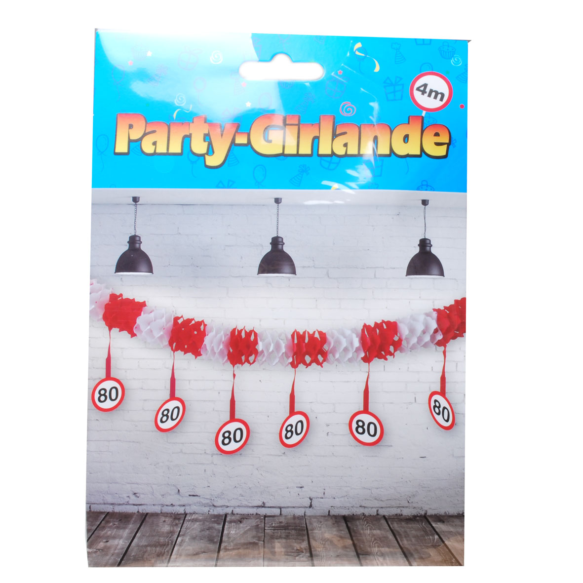 Die Verkehrsschilder mit der großen “80” drauf hängen 12 mal von der Girlande herab und verdeutlichen: hier wird der 80. Geburtstag gefeiert.