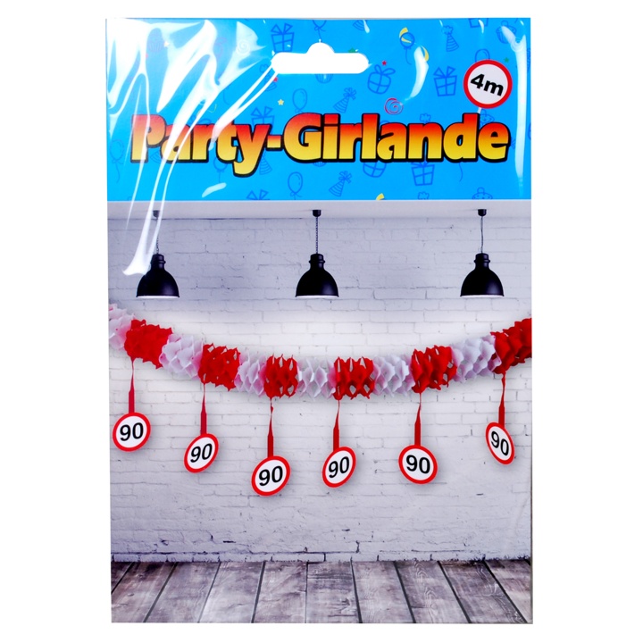 Die Verkehrsschilder mit der großen “90” drauf hängen 12 mal von der Girlande herab und verdeutlichen: hier wird der 90. Geburtstag gefeiert.