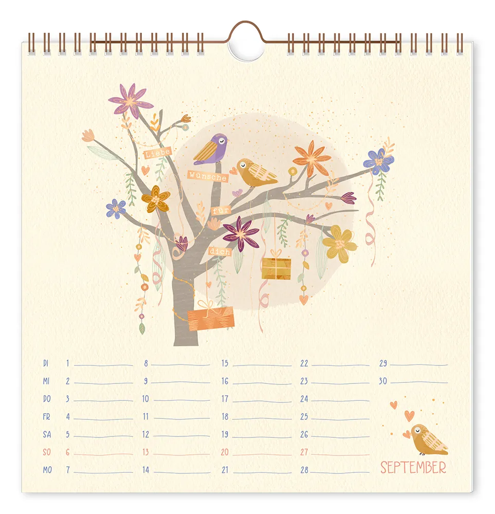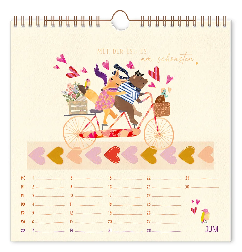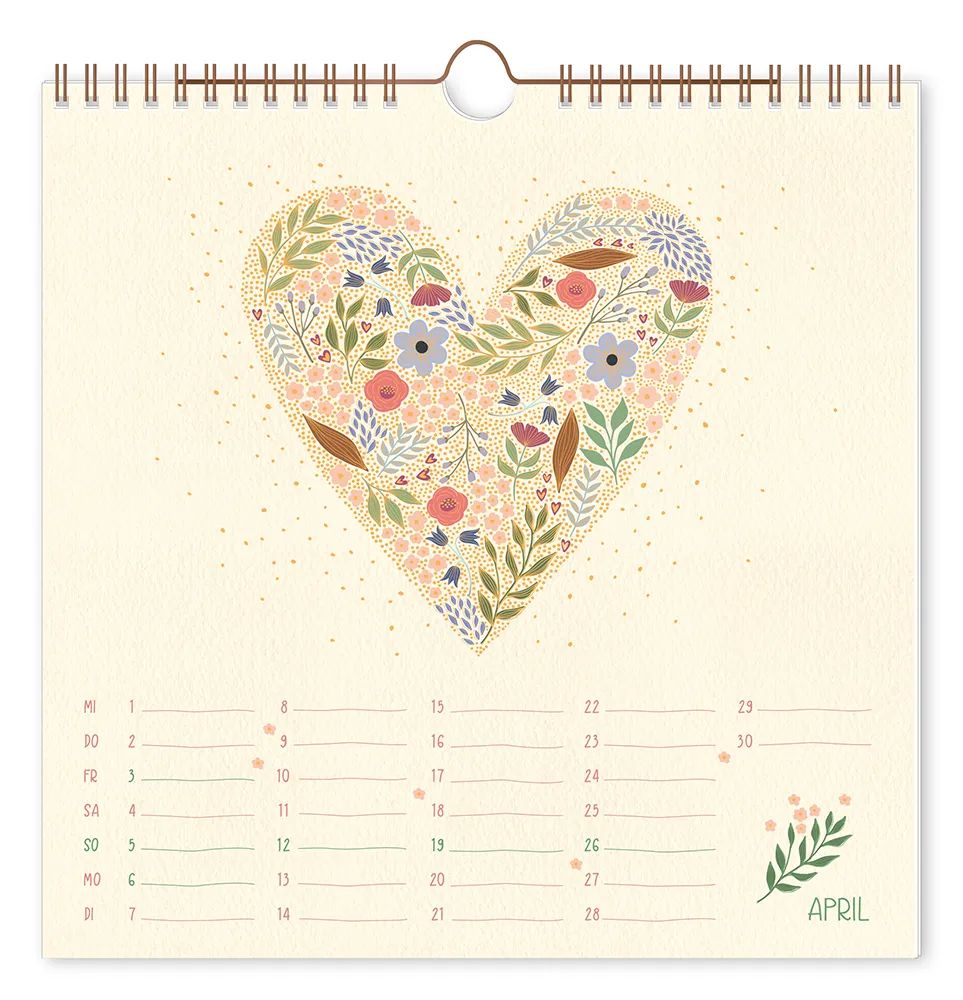 Schon das sanft gelbe Deckblatt mit dem filigranen Herz aus Blumen und Zweigen und dem goldenen Schriftzug „Lieblingstage“ lädt zum Träumen ein. Es ist der perfekte Auftakt für ein Jahr voller Herzensmomente, das Sie Monat für Monat mit liebevoll illustrierten Kalenderseiten begleitet. Jeder Monat überrascht mit einem individuellen, farbenfrohen Motiv und einem kleinen Spruch, der berührt – mal leicht, mal tiefgründig, aber immer mit Seele.
