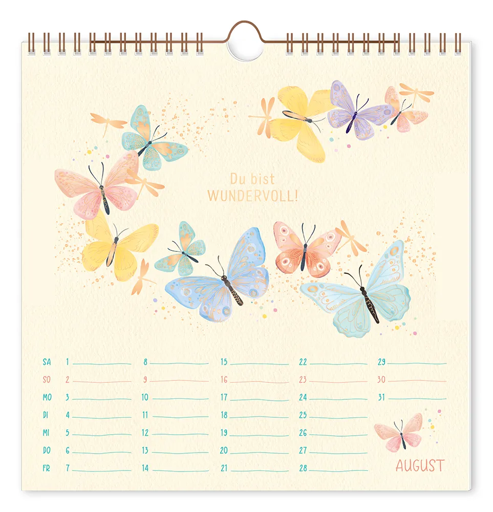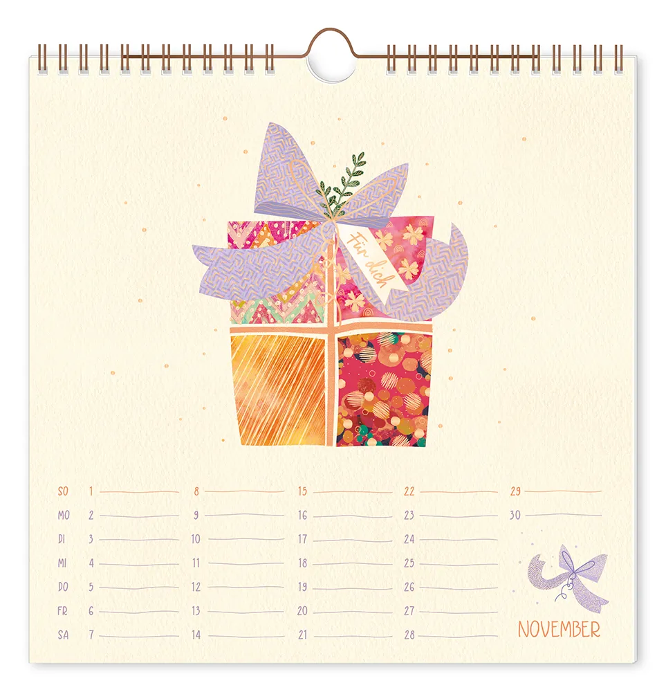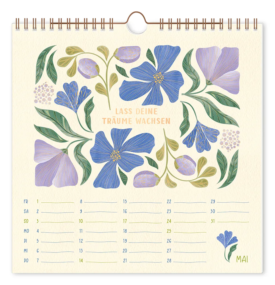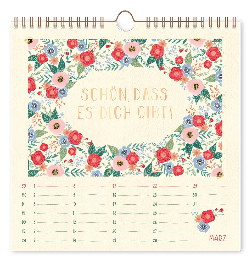 Die hochwertigen Seiten aus edlem Fedrigoni-Papier glänzen durch feine Prägungen und zarte Goldveredelungen. Doch dieser Kalender ist mehr als nur schön – er ist ein kleines Kunstwerk, das zum Weitergeben einlädt. Denn jede Monatsseite ist gleichzeitig eine ausschneidbare Postkarte. So können Sie Ihre schönsten Lieblingstage teilen und lieben Menschen kleine Freuden schicken – per Hand und von Herzen.