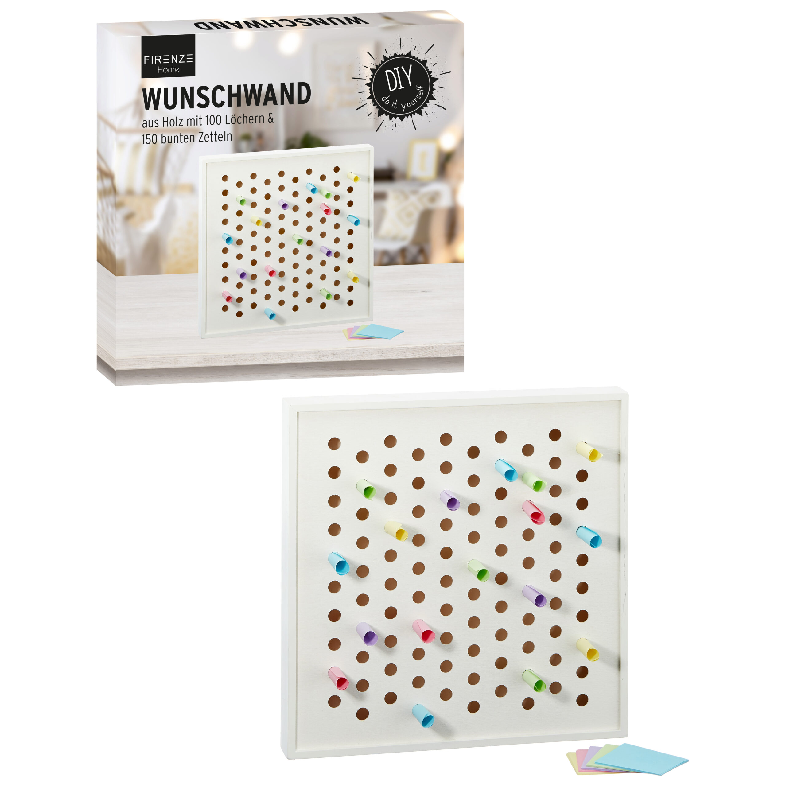 Die 100 Löcher in der Wand bieten ausreichend Platz für allerlei gute Wünsche und liebe Worte. Mitgeliefert werden 150 bunte Papierzettel, auf denen Wünsche niedergeschrieben werden können. Die Zettel können leicht aufgerollt in die Löcher gesteckt werden und halten sicher an ihrem Platz. Ob zur Hochzeit, zur Taufe oder zum Geburtstag – mit der Wunschwand können die Partygäste einfach und schnell ihre lieben Wünsche hinterlassen.